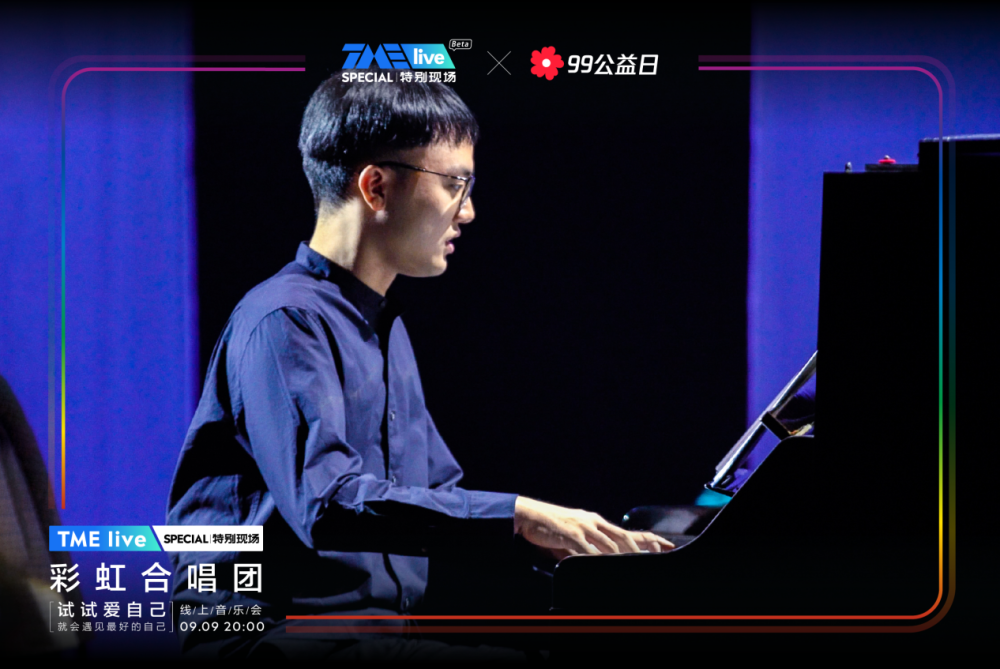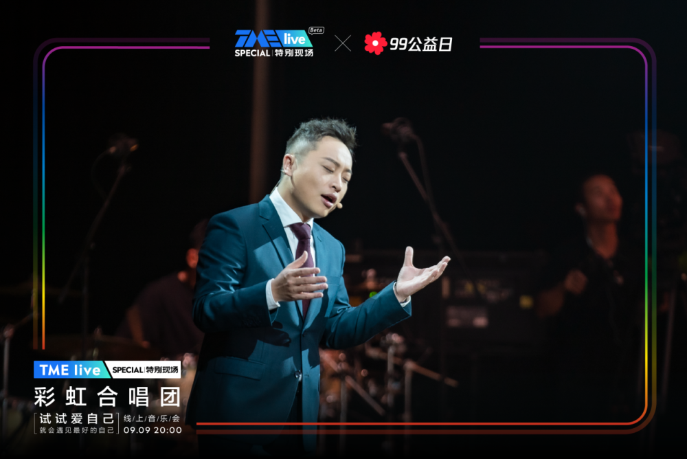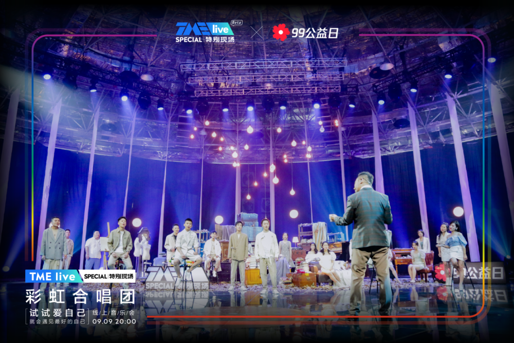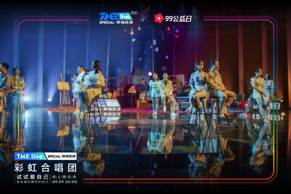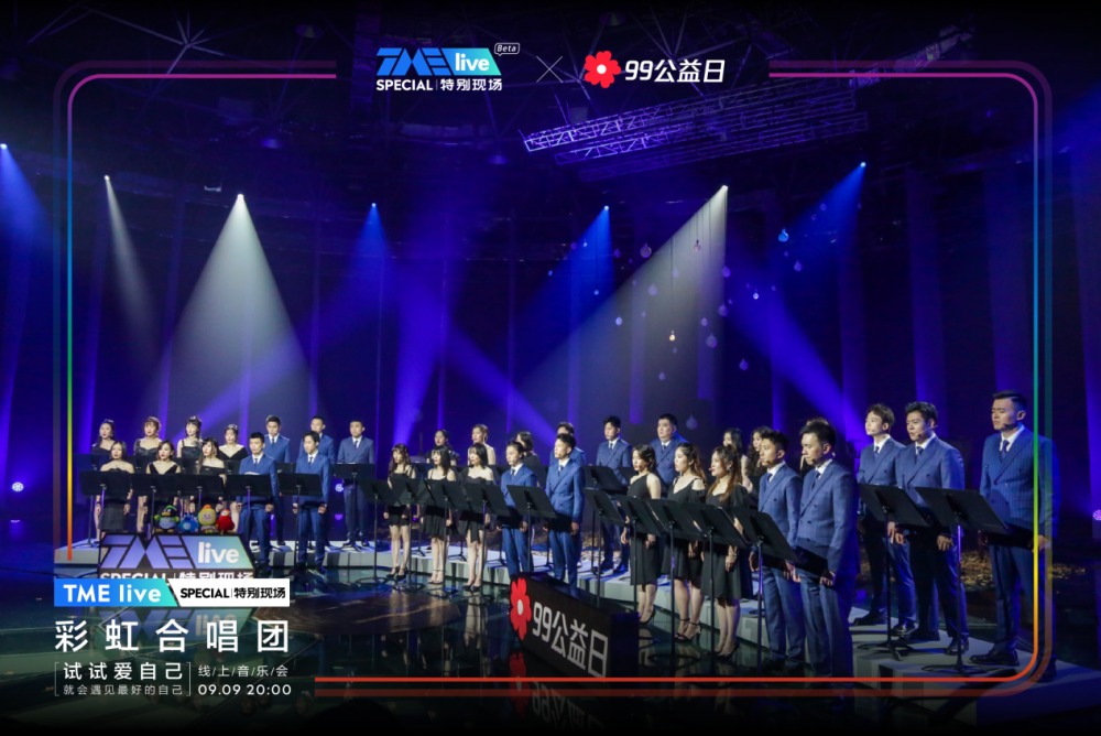 一年一度的腾讯公益“99公益日”收官之际,腾讯音乐娱乐集团(TME)旗下超现场演出品牌TME live携手上海彩虹室内唱团,于9月9日晚20:00在QQ音乐、酷狗音乐、酷我音乐、全民K歌四大平台同步呈现了「试试爱自己」线上公益音乐会。此次的特别现场,TME live为彩虹合唱团打造了首个专属线上音乐会舞台,十五首走心催泪音乐作品唱响整晚,将“爱自己,世界才更辽阔”的理念传递给观众,同时也为99公益日带去一个温暖又圆满的收尾。