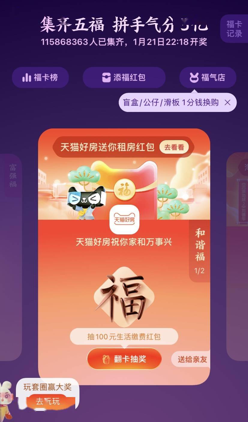 不过,在收集福卡的过程中,支付宝每年都会增加一些小变化。今年增加了热门的元宇宙玩法,用户的虚拟形象可以收集“福气”来兑换奖品。对像程心一样的老用户来说,上手难度并不高。1月17日,活动上线一周,已经有1.16亿人成功集齐五福,平均下来,每个人可以分到4.3元。