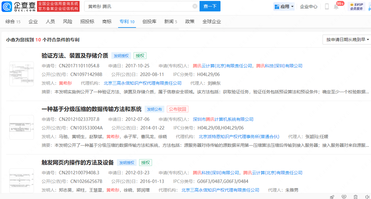公开资料显示,2005年至2017年,黄希彤作为专利发明人,腾讯公司作为专利申请人,共关联10项专利。包含“验证方法、装置及存储介质”“一种在评论或回复中上传图片的方法和装置”“触发网页内操作的方法及设备”等。