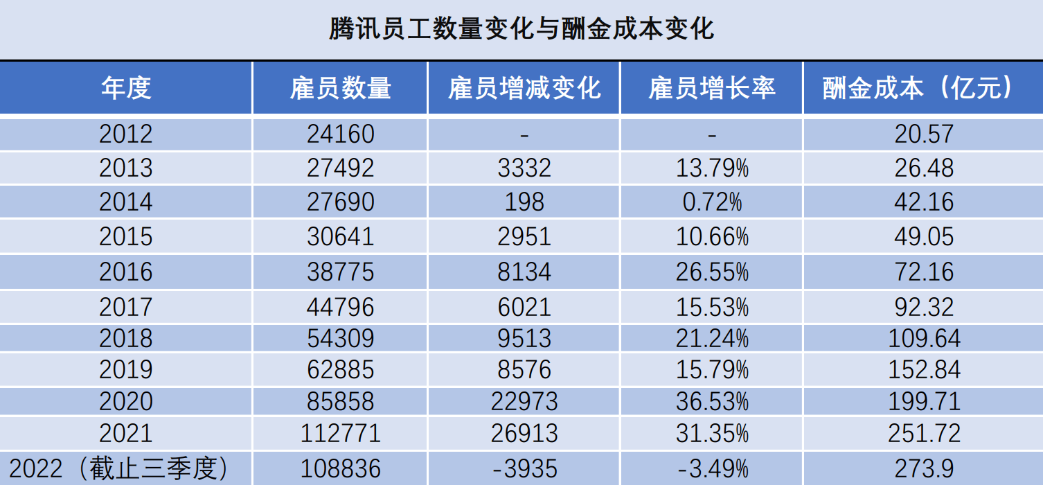 据搜狐科技统计,近五年来腾讯从未削减过员工的整体数量,2012年至2021年,腾讯员工数均保持增长,2021年员工较2020年增长近2.7万人,增长率达31%。