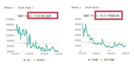 根据七麦数据,《晶核》随后3月内的下载量和日均收入持续走低。另外Sensor Tower数据显示,《晶核》在8月进入中国iOS手游收入榜前五,朝夕光年的收入相应增长20.8%,位列收入榜第6名。而在10月,《晶核》排名掉至第15名,朝夕光年的排名也随之下滑。