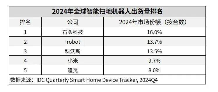 根据IDC去年发布的数据,在全球智能扫地机器人出货量排名中,石头科技以16%的市场份额位列第一,随后是科沃斯、小米、追觅等品牌。